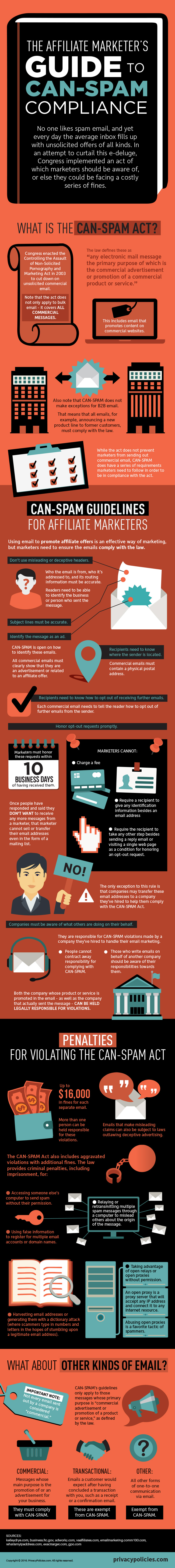 This infographic The Affiliate Marketer’s Guide to CAN-SPAM Compliance, is a useful resource for anyone who sends out marketing messages but wants to ensure that they don’t fall foul of the various rules of engagement and regulations that now exist.